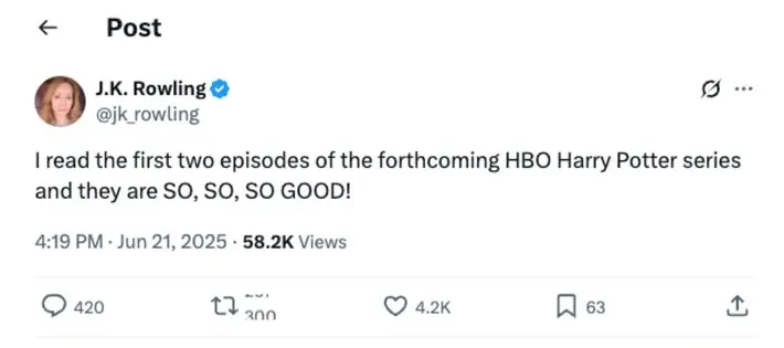 A série de Harry Potter nem começou, mas parece que J.K. Rowling, a autora da obra original, já teve acesso aos roteiros dos dois primeiros episódios. Como as expectativas estão nas alturas, isso chamou bastante atenção do público. De acordo com a análise inicial da autora, os episódios estão muito bons. Confira a sua postagem no X abaixo: