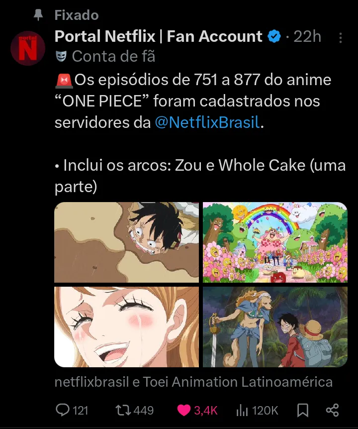 Mesmo sendo de forma extraoficial, os fãs já podem comemorar, pois foi uma informação do próprio Portal Netflix, que faz diversos vazamentos de dentro da Netflix e é bastante confiável. Recentemente, a página confirmou que os episódios 751 até o 877 de One Piece estão nos servidores internos da plataforma.